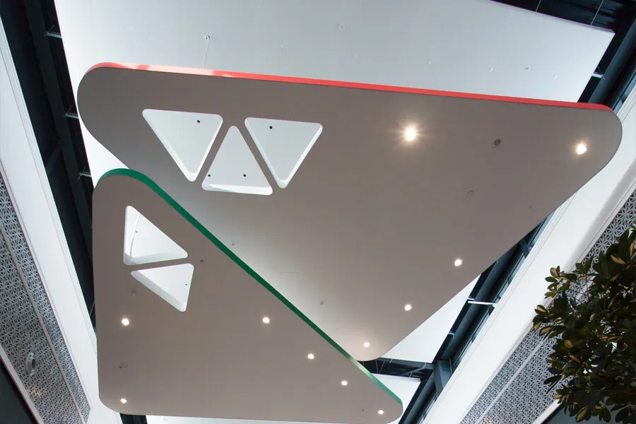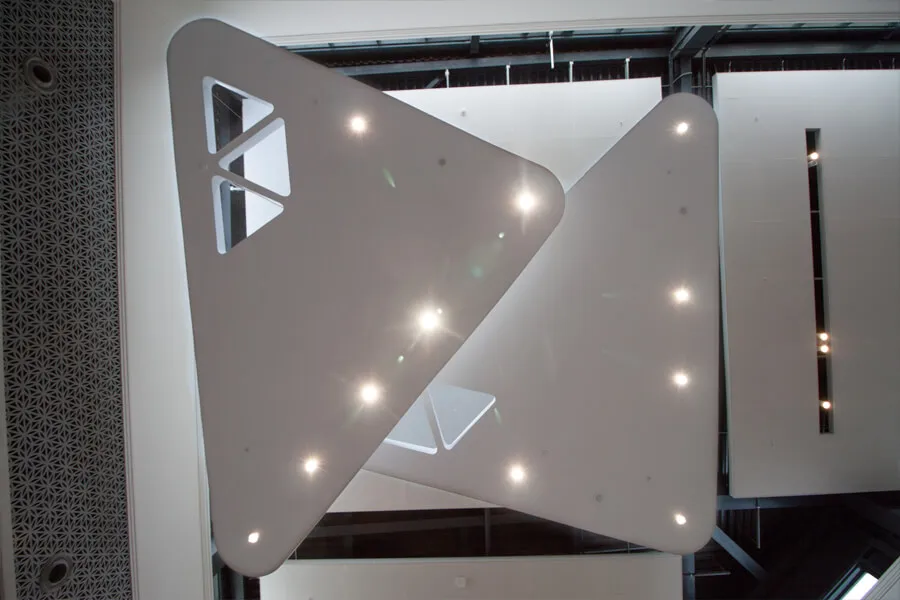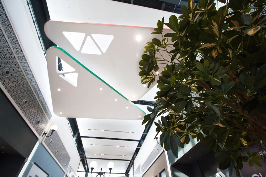 • В центральном атриуме использованы потолки-фрагменты Armstrong Optima L Canopy в форме треугольников, подвешенные на разной высоте, создающие эффект «парящих облаков».