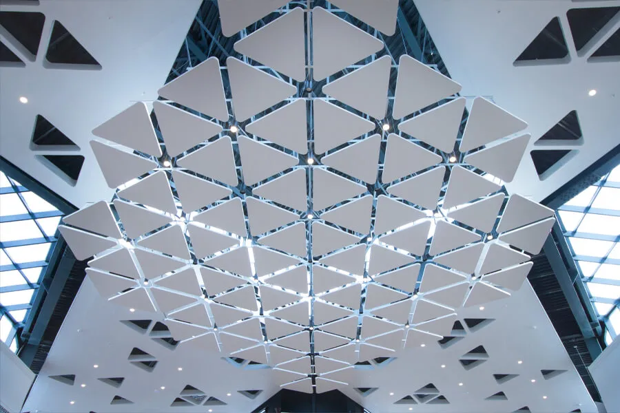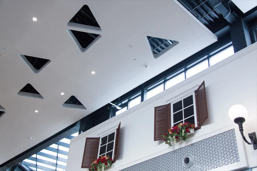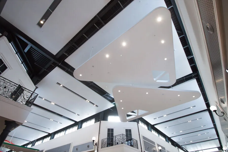 • Для обеспечения прочности конструкции использовалась подвесная система Armstrong LongSpan — специально адаптированная под большепролётные зоны.