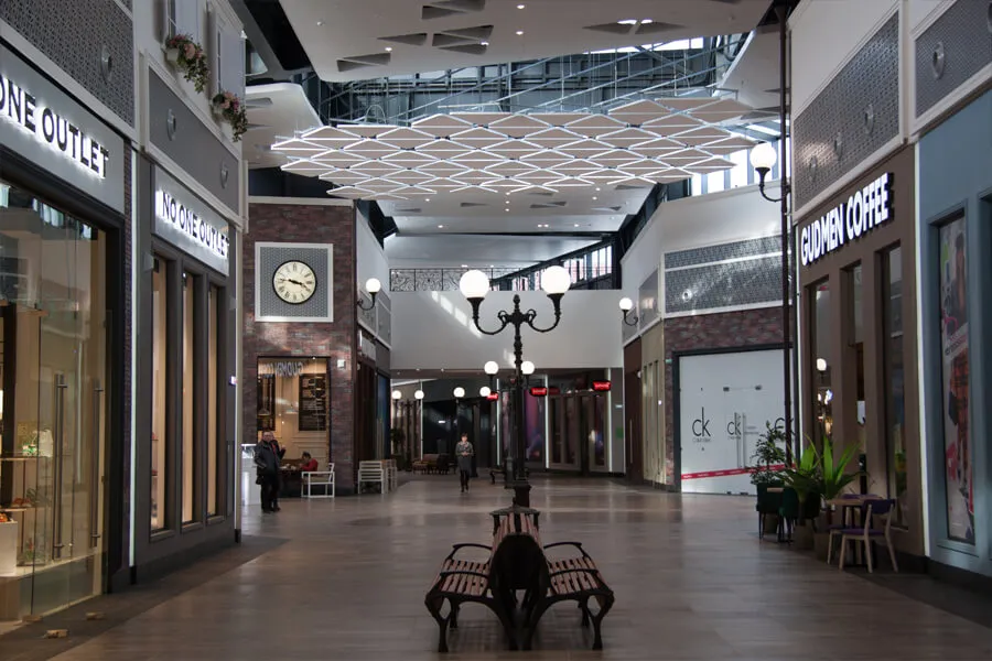 Реализовать креативную потолочную концепцию для первого аутлет-центра Екатеринбурга — создать легкое, «парящее» пространство, подчёркивающее витрины бутиков и атмосферу европейского торгового городка. Необходимо было предложить нестандартное решение с высокой эстетикой, инженерной надёжностью и архитектурной выразительностью.