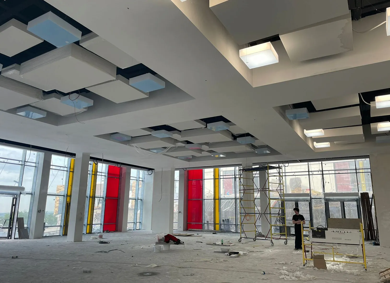 • Стены с яркими вертикальными витражами (красный, жёлтый) визуально сочетаются с «воздушным» потолком, создавая динамичную, но сбалансированную архитектурную среду.