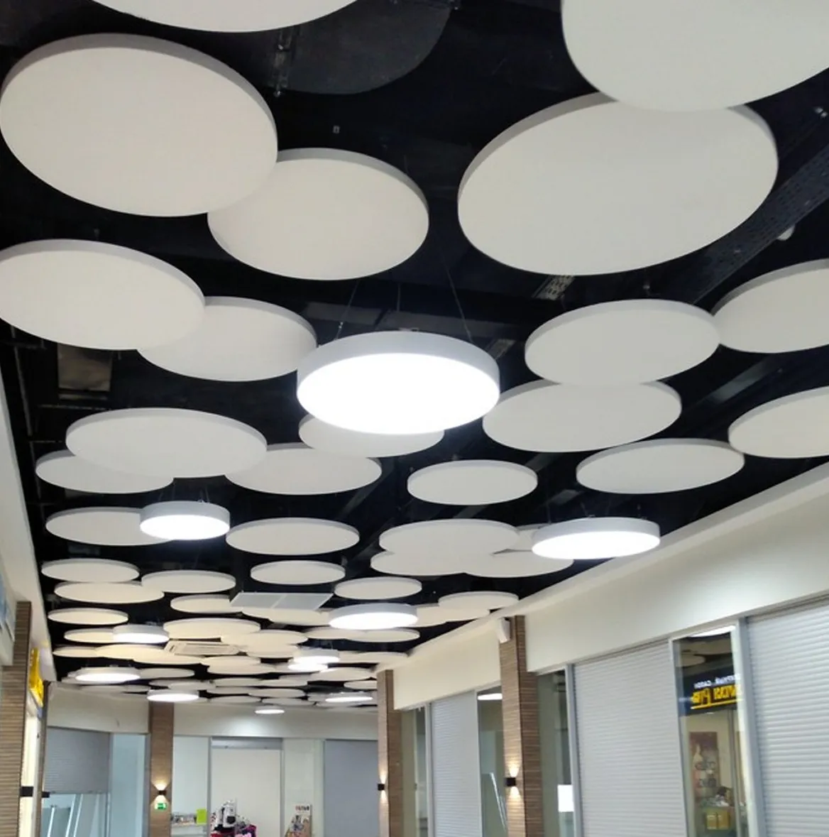 • В холлах и зонах ожидания использованы круглые подвесные акустические панели, улучшающие звукоизоляцию и формирующие визуальный ритм.