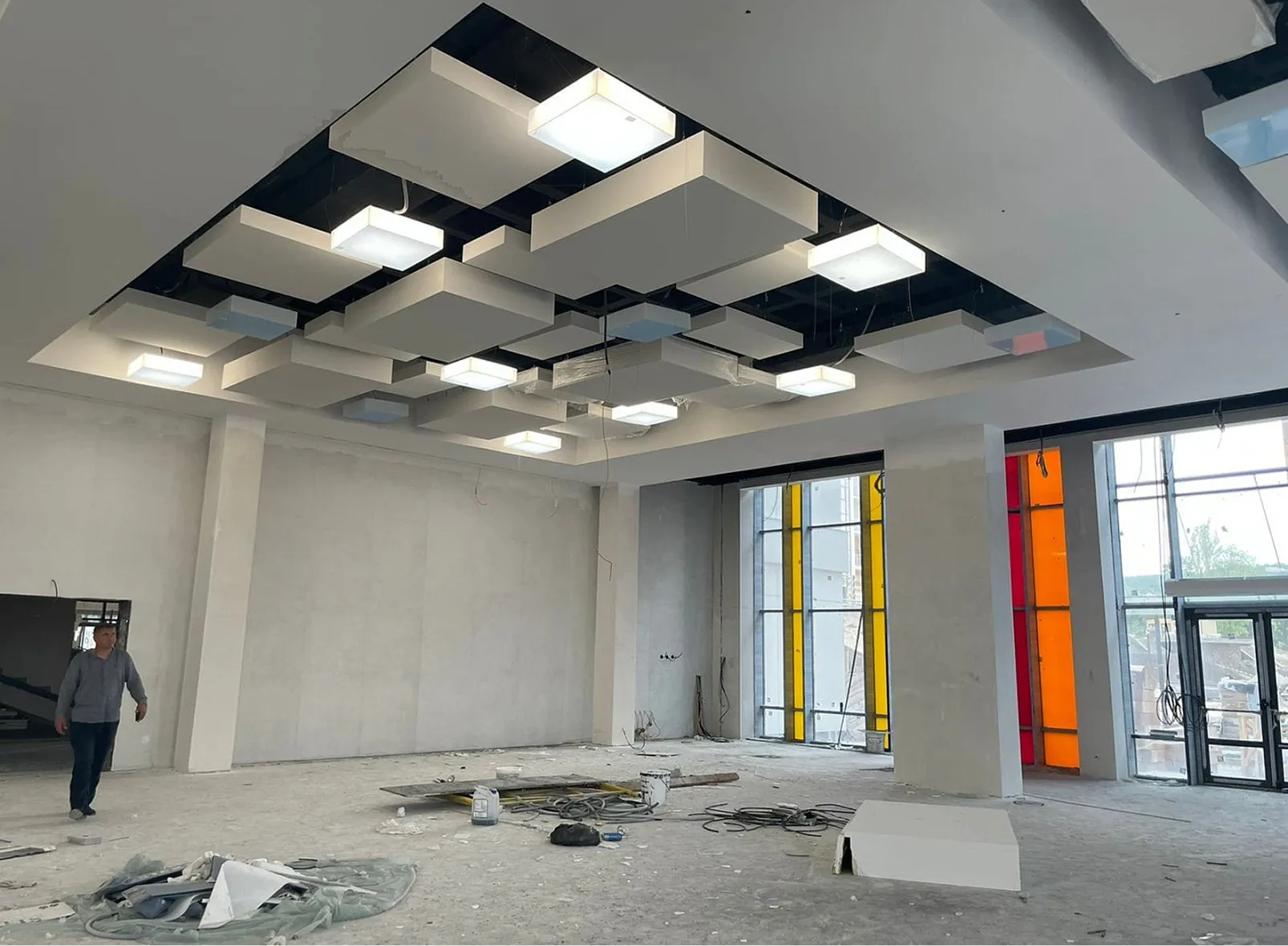 • В центральных зонах были реализованы подвесные объёмные потолочные элементы с чёткой геометрией — прямоугольные и квадратные панели на разных уровнях. Они создают «игру объёма» и подчёркивают высоту пространства.